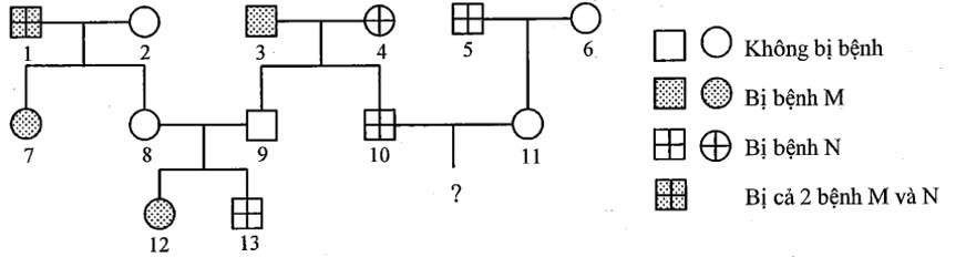 Sơ đồ phả hệ dưới đây mô tả sự di truyền của 2 bệnh M và N ở người; mỗi bệnh do một