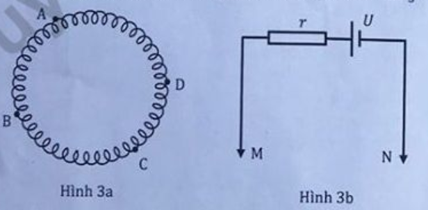 Một lò điện có sợi đốt được uốn thành một vòng dây dẫn điện khép kín (Hình 3a). Trên vòng dây, người ta đánh dấu bốn điểm A, B, C, D. Mắc hiệu điện thế U1, vào hai điểm A và B hoặc C và D thì công suất toả nhiệt của lò có cùng giá trị là P1. Còn khi mắc hiệu điện thế \({U_2} = \dfrac{{4{U_1}}}{3}\) vào hai điểm B và C hoặc A và D thì công suất toả nhiệt của lò có cùng giá trị là \({P_2} = \dfrac{{10{P_1}}}{9}\). Nếu mắc hiệu điện thế U3 = 9V vào hai điểm A và C thì công suất tỏa nhiệt của lò là P3 = 9W.