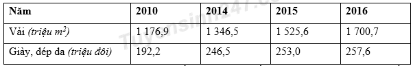 Theo bảng số liệu, để thể hiện sản lượng vải và giày, dép da của nước ta, giai đoạn 2010 - 2016, dạng biểu đồ nào sau đây là thích hợp nhất?