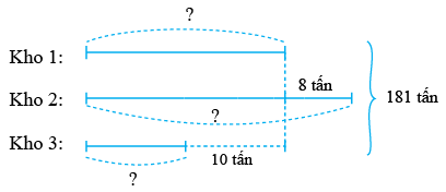 Người ta chuyển 181 tấn hàng hóa vào 3 kho hàng, biết kho thứ nhất ít hơn kho thứ hai 8 tấn và nhiều hơn kho thứ ba là 10 tấn. Hỏi mỗi kho hàng có bao nhiêu tấn hàng hóa?