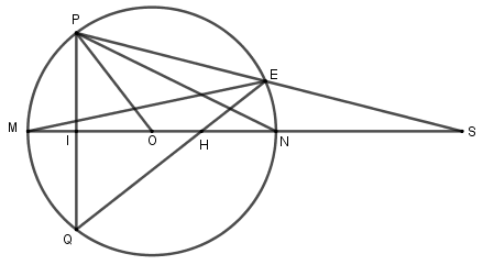 Cho đường tròn tâm O, đường kính MN, điểm I thay đổi trên đoạn OM (I khác M). Đường thẳng qua I vuông góc với MN cắt (O) tại P và Q. Trên tia đối của tia NM lấy điểm S cố định. Đoạn PS cắt (O) tại E, gọi H là giao điểm của EQ và MN.