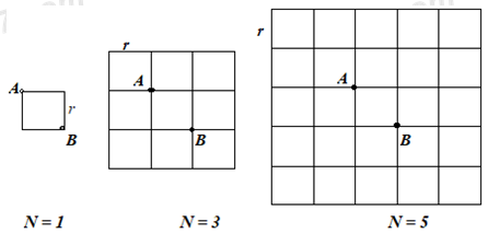 Tính điện trở tương đương RAB đối với mạng điện trở hình vuông với kích cỡ lần lượt là N = 1, 3, 5.