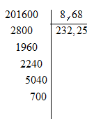Số dư của phép chia \(2016:8,68\) (thương lấy đến 2 chữ số ở phần thập phân) là: