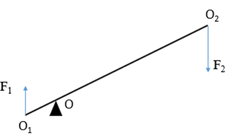 Người ta sử dụng một đòn bẩy như hình vẽ. Biết \(O{O_1} = 10\,\,cm;\,\,O{O_2} = 60\,\,cm\). Người ta tác dụng vào điểm O2 lực có độ lớn \(150\,\,N\). Tính độ lớn lực F1 tại điểm O1?