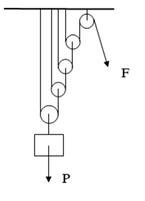 Cho hệ ròng rọc như hình vẽ. Vật nặng có trọng lượng \(1200\,\,N\). Để kéo được vật lên thì lực F cần thiết là bao nhiêu? Tính công để kéo vật lên cao \(4\,\,m\)? Các ròng rọc có khối lượng không đáng kể, ma sát rất nhỏ.
