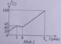 độ môi trường đến lúc nước sôi mất thời gian là T0. Trong khi đun có một khoảng thời gian ngắn mất điện nên đường biểu diễn nhiệt độ của nước theo thời gian có dạng như hình 2. Biết nhiệt lượng nước thải ra môi trường tỷ lệ thuận với thời gian; nước có nhiệt dung riêng là 4200 J/kg.K.