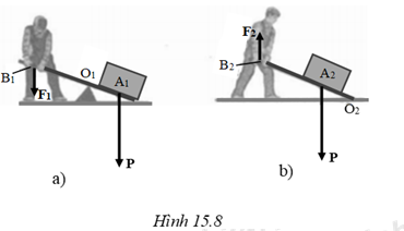 Hình 15.8 vẽ hai người dùng đòn bẩy để nâng cùng một vật nặng. Nếu gọi F1 là lực ấn của tay người ở hình 15.8a, F2 là lực nâng của người ở hình 15.8b thì