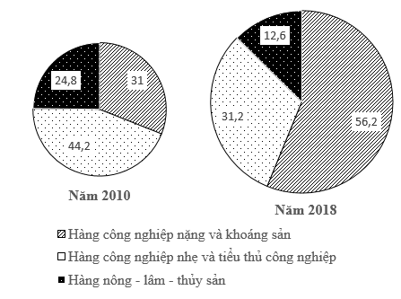 Theo biểu đồ, nhận xét nào sau đây đúng về sự thay đổi tỉ trọng trong cơ cấu trị giá xuất khẩu hàng hóa phân theo nhóm hàng của nước ta năm 2018 so với năm 2010?