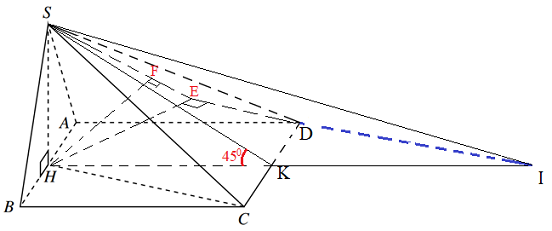 - Dựng \(HK \bot CD\,\,\,\left( {K \in CD} \right)\). Gọi \(I\) là điểm đối xứng \(H\) qua \(K\). Chứng minh \(d\left( {SD;HC} \right) = d\left( {H;\left( {SDI} \right)} \right)\).