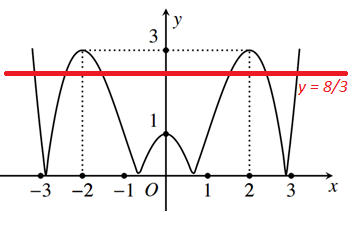 Cho hàm số \(y = f\left( x \right)\) có đồ thị như hình vẽ bên. Tìm số nghiệm thuộc đoạn \(\left[ {2017\pi ;2020\pi } \right]\) của phương trình \(3f\left( {2\cos x} \right) = 8\).