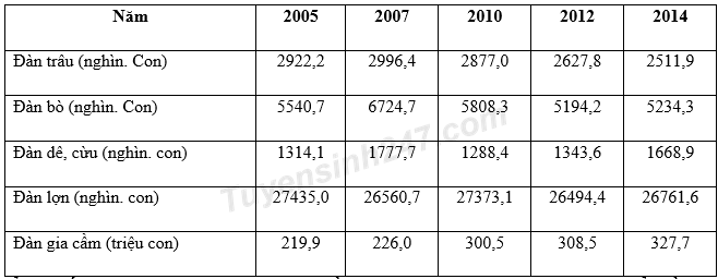 Cho bảng số liệu: Số lượng đàn gia súc, gia cầm của nước ta giai đoạn 2005 - 2014 Để thể