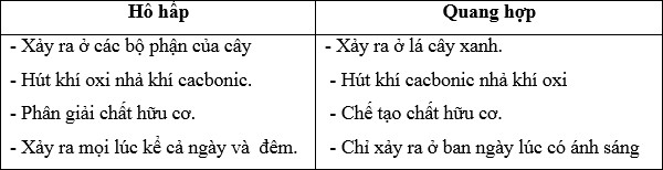 Nêu điểm khác nhau giữa quang hợp và hô hấp ?