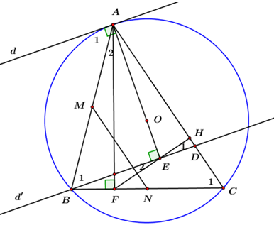 Cho tam giác \(ABC\) có ba góc nhọn \(\left( {AB < AC} \right)\) nội tiếp đường tròn tâm \(O.\) Kẻ đường thẳng \(d\) là tiếp tuyến tại \(A\) của đường tròn \(\left( O \right)\). Gọi \(d'\) là đường thẳng qua \(B\) và song song với \(d\); \(d'\) cắt các đường thẳng \(AO,AC\) lần lượt tại \(E,D\). Kẻ \(AF\) là đường cao của tam giác \(ABC\) (\(F\) thuộc \(BC\)).
