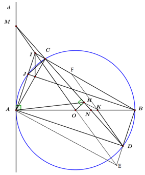 Cho đường tròn tâm \(O\), đường kính \(AB\) và \(d\) là một tiếp tuyến của đường tròn \(\left( O \right)\) tại điểm \(A\). Trên đường thẳng \(d\) lấy điểm \(M\) (khác \(A\)) và trên đoạn \(OB\) lấy điểm \(N\) (khác \(O\) và \(B\)). Đường thẳng \(MN\) cắt đường tròn \(\left( O \right)\) tại hai điểm \(C\) và \(D\) sao cho \(C\) nằm giữa \(M\) và \(D\). Gọi \(H\) là trung điểm của đoạn thẳng \(CD\).