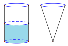Một chiếc cốc thủy tinh có dạng hình trụ, chiều cao bằng 10cm và chứa một lượng nước có thể tích bằng một nửa thể tích của chiếc cốc. Một chiếc cốc thủy tinh khác có dạng hình nón (không chứa gì cả) và có bán kính đáy bằng bán kính đáy chiếc cốc hình trụ đã cho (hình vẽ bên). Biết rằng khi đổ hết lượng nước trong chiếc cốc hình trụ vào chiếc cốc hình nón thì chiếc cốc hình nón đầy nước và không có nước tràn ra ngoài. Tính chiều cao của chiếc cốc có dạng hình nón (bỏ qua bề dày của thành cốc và đáy cốc).