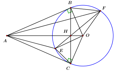 Từ một điểm \(A\) bên ngoài đường tròn tâm \(O\) vẽ các tiếp tuyến \(AB,\,\,AC\) (\(B\) và \(C\) là các tiếp điểm). Gọi \(H\) là giao điểm của \(OA\) và \(BC\).
