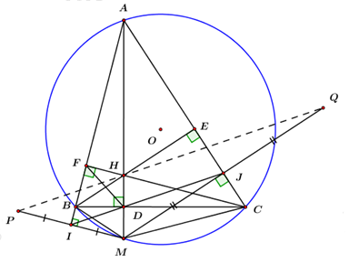 Cho \(\Delta ABC\) có ba góc nhọn nội tiếp đường tròn \(\left( O \right),\) các đường cao \(AD,\,\,BE,\,\,CF\) cắt nhau tại \(H.\) Đường thẳng \(AD\) cắt đường tròn \(\left( O \right)\) tại \(M \ne A.\)