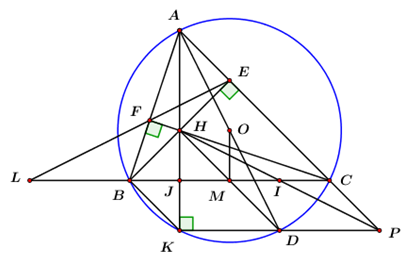 Cho \(\Delta ABC\) nhọn nội tiếp đường tròn \(\left( O \right)\) có hai đường cao \(BE\) và \(CF\) cắt nhau tại trực tâm \(H,\,\,AB < AC.\) Vẽ đường kính \(AD\) của \(\left( O \right).\) Gọi \(K\) là giao điểm của đường thẳng \(AH\) với đường tròn \(\left( O \right),\,\,\,K \ne A.\) Gọi \(L,\,\,P\) lần lượt là giao điểm của hai đường thẳng \(BC\) và \(EF,\,\,AC\) và \(KD.\)