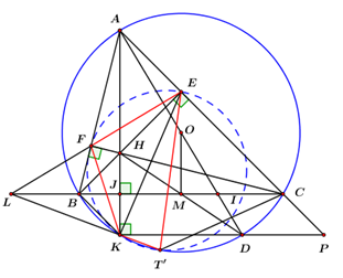 3) Gọi \(T\) là giao điểm của đường tròn \(\left( O \right)\) với đường tròn ngoại tiếp \(\Delta EFK,\,\,\,T \ne K.\)Chứng minh rằng ba điểm \(L,\,\,K,\,\,T\) thẳng hàng.