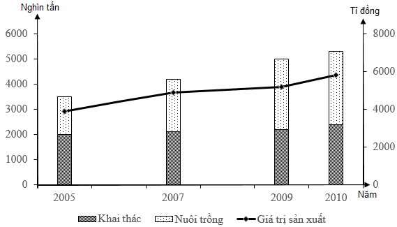 Theo biểu đồ, nhận xét nào sau đây đúng về sự thay đổi sản lượng và giá trị ngành thủy sản của nước ta giai đoạn 2005-2010?