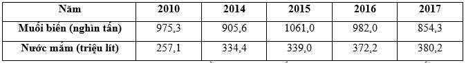 Theo bảng số liệu, nhận xét nào sau đây đúng với sản lượng muối biển và nước mắm của nước ta, giai đoạn 2010 - 2017?