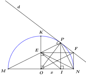 Cho nửa đường tròn \(\left( O \right),\) đường kính \(MN,\) điểm \(P\) thuộc nửa đường tròn \(\left( {PM > PN} \right).\) Kẻ bán kính \(OK\) vuông góc với \(MN\) cắt dây \(MP\) tại \(E.\) Gọi \(d\) là tiếp tuyến tại \(P\) của nửa đường tròn. Đường thẳng đi qua \(E\) và song song với \(MN\) cắt \(d\) ở \(F.\) Chứng minh rằng:
