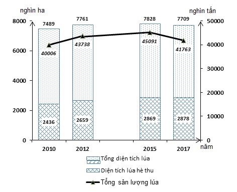 Nhận xét nào đúng về diện tích và sản lượng lúa của nước ta giai đoạn 2010 - 2017?