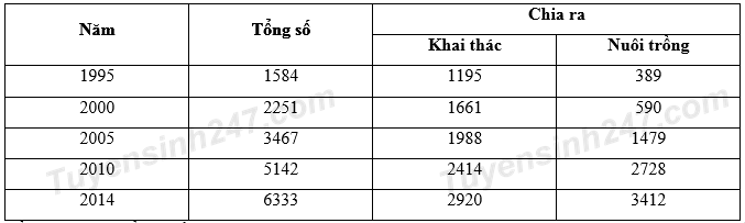 Cho bảng số liệu: Sản lượng thủy sản của nước ta giai đoạn 1995 – 2014 (đơn vị: nghìn