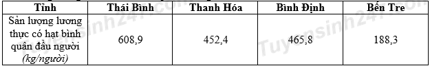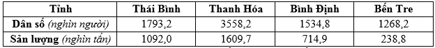 Cho bảng số liệu: DÂN SỐ VÀ SẢN LƯỢNG LƯƠNG THỰC CÓ HẠT CỦA MỘT SỐ TỈNH NĂM