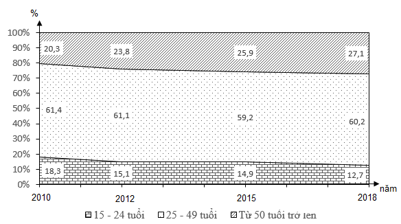 Cho biểu đồ về lao động từ 15 tuổi trở lên phân theo nhóm tuổi của nước ta giai đoạn 2010 – 2018: