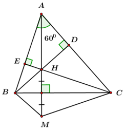 Cho tam giác nhọn ABC có \(\angle A = {60^o},\) trực tâm H. Gọi M là điểm đối xứng với H qua BC.
