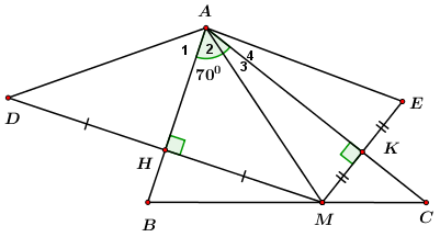 Cho tam giác ABC có \(\angle A = {70^o}\), điểm M thuộc cạnh BC. Vẽ điểm D đối xứng với M qua AB, vẽ điểm E đối xứng với M qua AC.