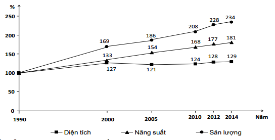 Biểu đồ thể hiện diện tích, năng suất và sản lượng lúa nước tă giai đoạn 1990 - 2014