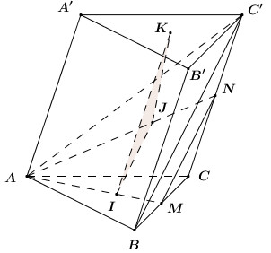 - Gọi \(M,\,\,N\) lần lượt là trung điểm của \(BC,\,\,CC'\). Sử dụng định lí Ta-lét đảo chứng minh \(IJ\parallel MN\). Từ đó chứng minh \(IJ\parallel BC'\).