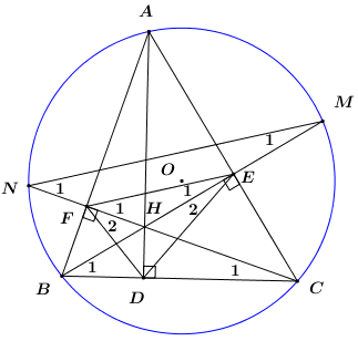 2. \(BE\) và \(CF\) cắt đường tròn \(\left( O \right)\) lần lượt tại \(M,\,\,N\). Chứng minh \(MN//EF\).