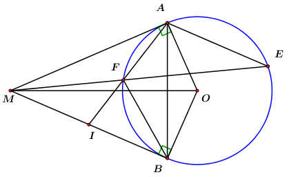 Từ một điểm \(M\) ở ngoài đường tròn \(\left( O \right),\) vẽ hai tiếp tuyến \(MA,\,\,MB\) đến đường tròn (\(A,\,\,B\) là hai tiếp điểm). Qua \(A\) vẽ đường thẳng song song với với \(MB\) cắt đường tròn tại \(E,\) đoạn thẳng \(ME\) cắt đường tròn tại \(F.\) Hai đường thẳng \(AF\) và \(MB\) cắt nhau tại \(I.\) Chứng minh: