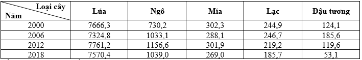 Cho bảng số liệu: DIỆN TÍCH GIEO TRONG MỘT SỞ CẢY HÀNG NĂM CỦA NƯỚC TA (Đơn vị: nghìn