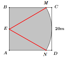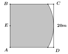 Một vườn có hình vuông ABCD có cạnh \(20m\) như hình vẽ. Người ta buộc một con dê bằng sợi dây thừng dài \(20m\) tại trung điểm E của cạnh AB. Tính diện tích phần cỏ mà con dê có thể ăn được (phần tô đậm trên hình vẽ) (Kết quả làm tròn đến hai chữ số thập phân).
