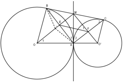 b) Gọi E là giao điểm của OM và AB, F là giao điểm của O’M và AC. Chứng minh tứ giác AEMF là hình chữ nhật.