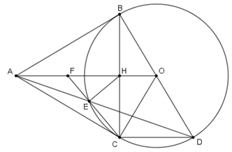 Cho đường tròn \(\left( {O;R} \right)\) và \(A\) là một điểm nằm bên ngoài đường tròn. Từ điểm A kẻ hai tiếp tuyến \(AB\) và \(AC\) với đường tròn \(\left( O \right)\) ( B và C là hai tiếp điểm). Gọi \(H\) là giao điểm của \(AO\) và \(BC\). Kẻ đường kính \(BD\) của đường tròn \(\left( O \right)\), \(AD\) cắt đường tròn tại điểm thứ hai là \(E\).