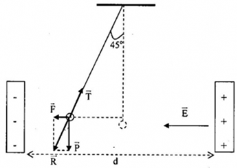 Một quả cầu kim loại nhỏ khối lượng \(m = 1g,\) mang điện tích \(q = {5.10^{ - 6}}{\mkern 1mu} {\mkern 1mu} C\), được treo vào sợi dây dài mảnh, khối lượng không đáng kể. Giữa hai bản kim loại song song tích điện trái dấu đặt thẳng đứng tại nơi có gia tốc \(g = 10{\mkern 1mu} {\mkern 1mu} m/{s^2}\). Lúc vật cân bằng dây treo hợp với phương thẳng đứng góc \({45^0}\). Biết khoảng cách giữa hai tấm kim loại là \(d = 10cm.\) Hiệu điện thế giữa hai tấm kim loại?