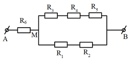 Cho mạch điện như hình vẽ. Biết \({R_1} = {R_3} = 4\,\,\Omega \); \({R_2} = {R_4} = {R_6} = 5\,\,\Omega \);