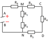 Cho mạch điện như hình vẽ. Biết \({R_1} = {R_3} = 4\,\,\Omega \); \({R_2} = {R_4} = {R_6} = 5\,\,\Omega \); \({R_5} = 9\,\,\Omega \). Tính điện trở tương đương của đoạn mạch.