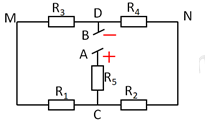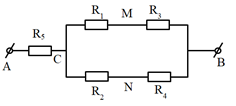 Cho mạch điện như hình vẽ. Biết \({R_1} = {R_2} = 10\,\,\Omega \); \({R_3} = {R_4} = 15\,\,\Omega \); \({R_5} = 7,5\,\,\Omega \). Tính điện trở tương đương của mạch điện.