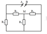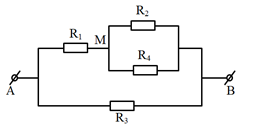 Cho mạch điện như hình vẽ. Biết \({R_1} = {R_3} = 18\,\,\Omega \); \({R_2} = 27\,\,\Omega \); \({R_4} =
