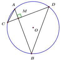 Cho đường tròn \(\left( {O;\,\,R} \right)\) và một điểm \(M\) nằm bên trong đường tròn đó. Qua \(M\) kẻ hai dây cung \(AB,\,\,CD\) vuông góc với nhau (\(C\) thuộc cung \(AB\) nhỏ). Chứng minh rằng \(MA.MB = MC.MD.\)