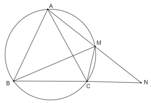 Cho \(\Delta ABC\) cân tại \(A\) nội tiếp đường tròn \(\left( O \right).\) \(M\) là một điểm bất kỳ thuộc cung nhỏ \(AC.\) Tia \(AM\) cắt \(BC\) tại \(N.\) Chứng minh rằng: \(A{B^2} = AM.AN\) và \(\angle ACM = \angle ANC.\)