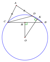 Cho tam giác ABC có\(AB > AC\). Trên cạnh AB lấy một điểm D sao cho \(AD = AC\). Vẽ đường tròn tâm O ngoại tiếp tam giác DBC. Từ O lần lượt hạ các đường vuông góc OH, OK xuống BC và BD \(\left( {H \in BC,K \in BD} \right)\)