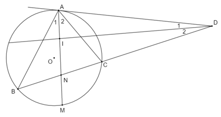 Cho A, B, C là ba điểm thuộc đường tròn (O) sao cho tiếp tuyến tại A cắt tia BC tại D. Tia phân giác của \(\angle BAC\)cắt đường tròn ở M, tia phân giác của \(\angle D\) cắt AM ở I. Chứng minh \(DI \bot AM.\)