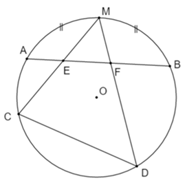 Cho đường tròn tâm O bán kính R và dây AB bất kì. Gọi M là điểm chính giữa của cung nhỏ AB. E và F là hai điểm bất kì trên dây AB. Gọi C và D tương ứng là giao điểm của ME, MF với đường tròn (O). Chứng minh \(\angle EFD + \angle ECD = {180^0}.\)
